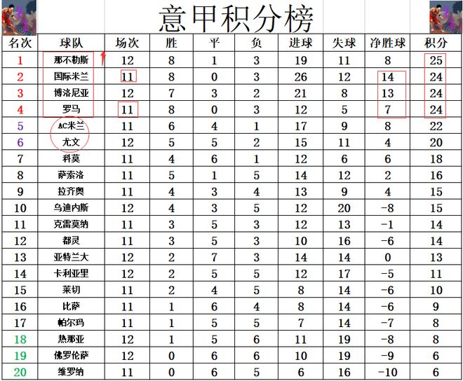 积分榜方面,那不勒斯今天主场赢球止住颓势后,先赛的他们超过国米和罗马1分,暂时重回榜首。博洛尼亚豪夺3连胜,暂时追上国米和罗马,净胜球优劣势排在第3。尤文无力赢球追上AC米兰,差AC米兰2分排在第6。