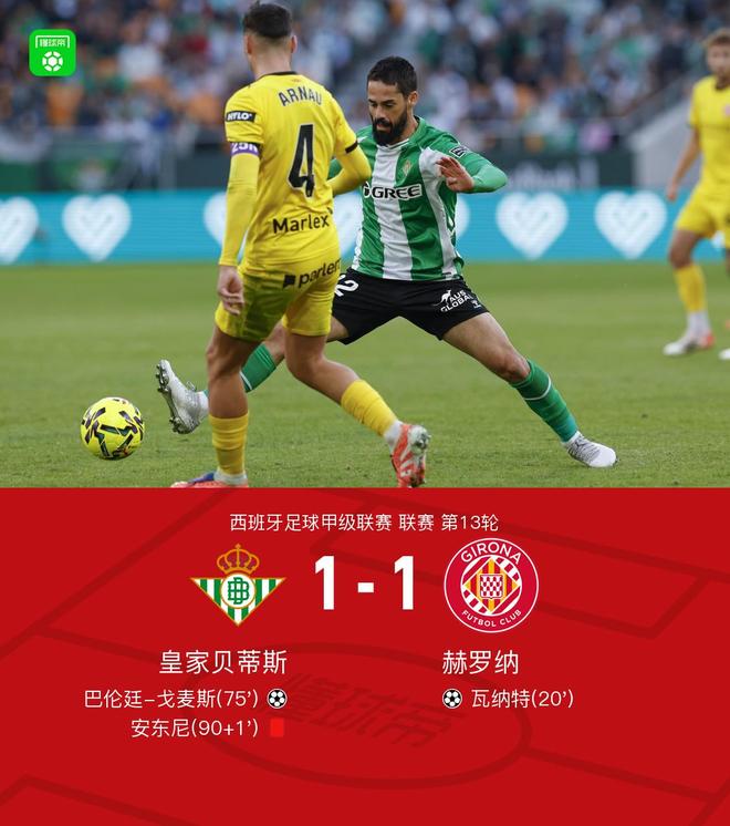北京时间11月23日,西班牙足球甲级联赛第13轮,皇家贝蒂斯主场迎战赫罗纳。比赛中,赫罗纳球员瓦纳特接布赖恩-希尔助攻率先破门。随后,皇家贝蒂斯由巴伦廷-戈麦斯在伊斯科的助攻下扳平比分。下半场补时阶段,皇家贝蒂斯球员安东尼被红牌罚下。最终全场比赛结束,双方以1-1握手言和。